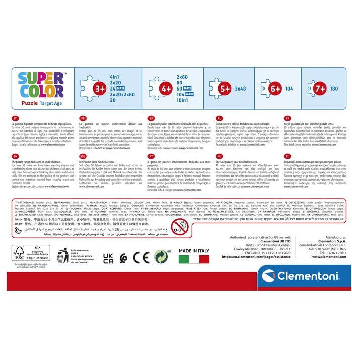 Desde sempre atenta ao problema da ecologia, a Clementoni utiliza amplamente materiais reciclados, evitando o uso de componentes poluentes. Made in Italy.